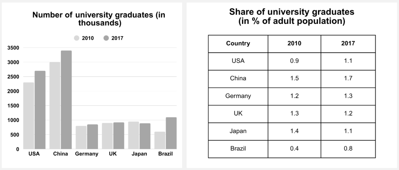 The bar chart and the table below show the number of university graduates in six countries and their share in the population in 2010 and 2017.